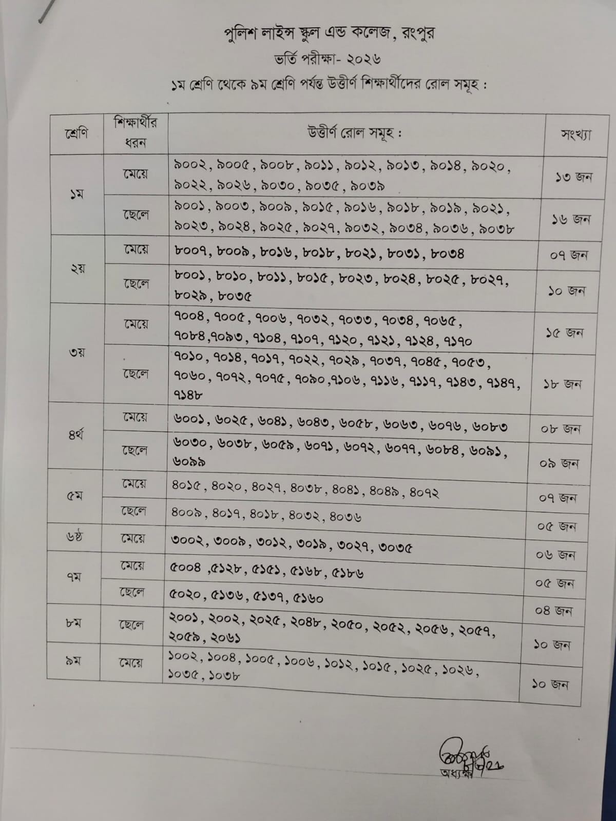 ভর্তি পরীক্ষার ফলাফল -২০২৬ স্কুল শাখা (১ম-৯ম) শ্রেণি